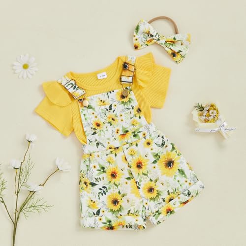Newborn Baby Girl Summer Clothes Ruffle Ribbed Short Sleeve Romper Daisy Suspender Overall Shorts Cute Summer Outfit 3