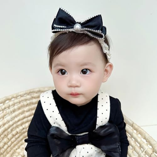 Bow Lace Headbands for Baby Girls Soft Tulle Ribbon Pearl Head Wrap Elastic Bow-knot Hair Band Shower Birthday Hair Accessory for Newborn Infant Toddler (Black B, Elastic) 1