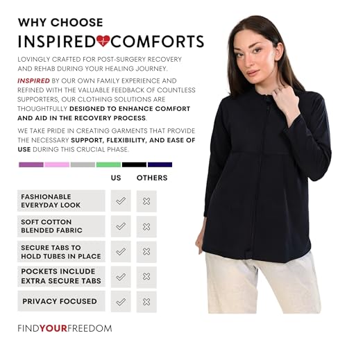 HOT ! Inspired Comforts Women's Mastectomy Recovery Full Sleeves Front Open Zip Up Shirt with Drain Pockets
