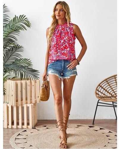 SimpleFun Womens Tank Tops Ruffle High Neck Pleated Summer Blouses Floral Sleeveless Shirt 6