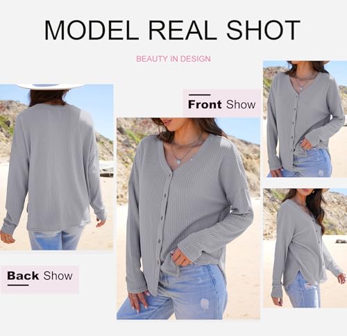 Dokotoo Women's Casual V Neck Waffle Knit Button Down Long Sleeve Shirts Loose Tops 5