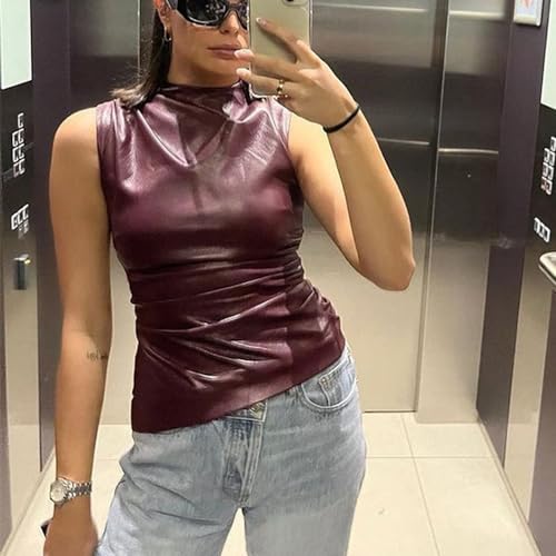Women's FashionFaux Leather Pleated Sleeveless Asymmetrical Mock Neck Slim Tank Top 1