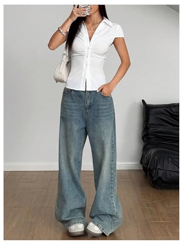 HOT ! SOLY HUX Women's Summer Button Down Shirts Ruched Collared V Neck Cap Sleeve Blouse Going Out Tops