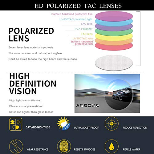 • Durable TAC Polarized Lens - the clearer of vision, the more convenient and safer life. Polarized lens can reduce glares and reflections, increase color contrast, improve vision, reduce eye fatigue and eyestrain. Great for driving, fishing, hiking, golf, etc