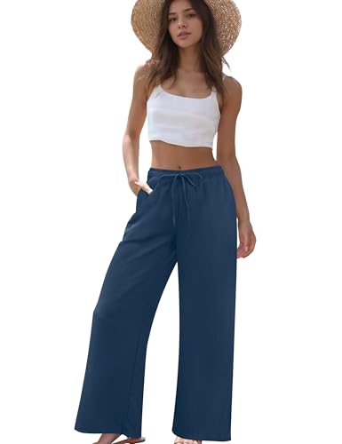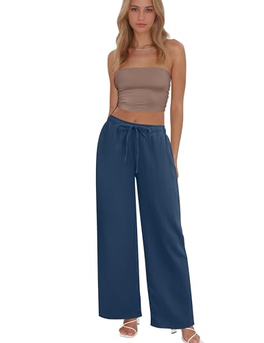 HOT ! Womens Wide Leg Palazzo Pants Dressy Casual Lounge Baggy Pant Summer Travel Loose Drawstring Elastic Waist Trouser with Pockets Navy Blue S