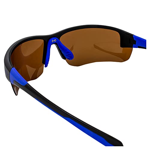 • Sporting a semi-rimless aerodynamic frame design & double-injected blue rubber on temples, these fishing sunglasses protect eyes without compromising style.