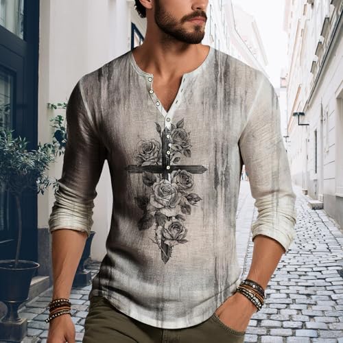 Mens Distressed Henley Shirt Cross Rose Print Tee Vintage Casual Long Sleeve Shirts Gothic Graphic Tops Lightweight 6
