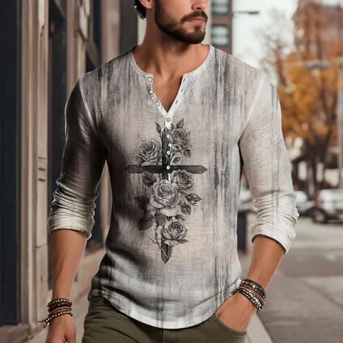 HOT ! Mens Distressed Henley Shirt Cross Rose Print Tee Vintage Casual Long Sleeve Shirts Gothic Graphic Tops Lightweight