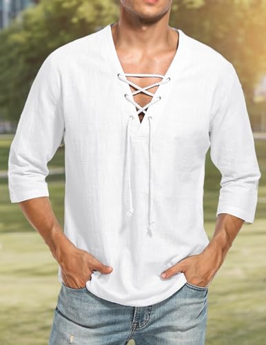 LecGee Men's Casual Cotton Linen Shirt Short Sleeve V Neck Lace Up Hippie Beach Tee Shirts Yoga Summer Top 5