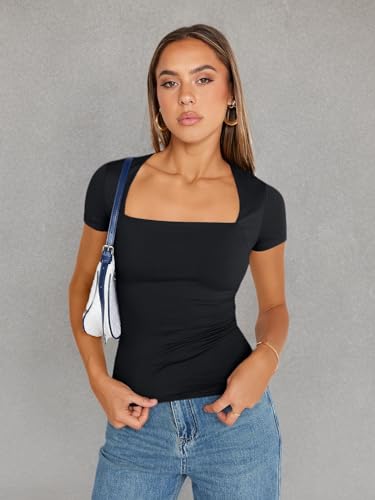Trendy Queen Women's Square Neck Tops Short Sleeve Shirts Double Lined Workout Summer Clothes Casual Slim Fit T-Shirts 1