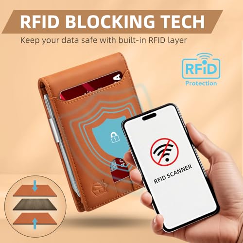 • ADVANCED RFID BLOCKING - Our state-of-the-art RFID blocking technology safeguards your personal information. It prevents unauthorized scanning and identity theft by blocking RFID signals of 13.56 MHz or higher. The wallet is built with a unique metal composite material that does the job effectively, giving you peace of mind.
