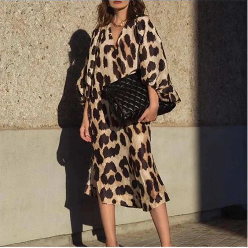 Leopard Printed Lantern Long Sleeved Women's Loose V-neck High Street Elegant Casual Dress. S-2X
