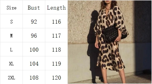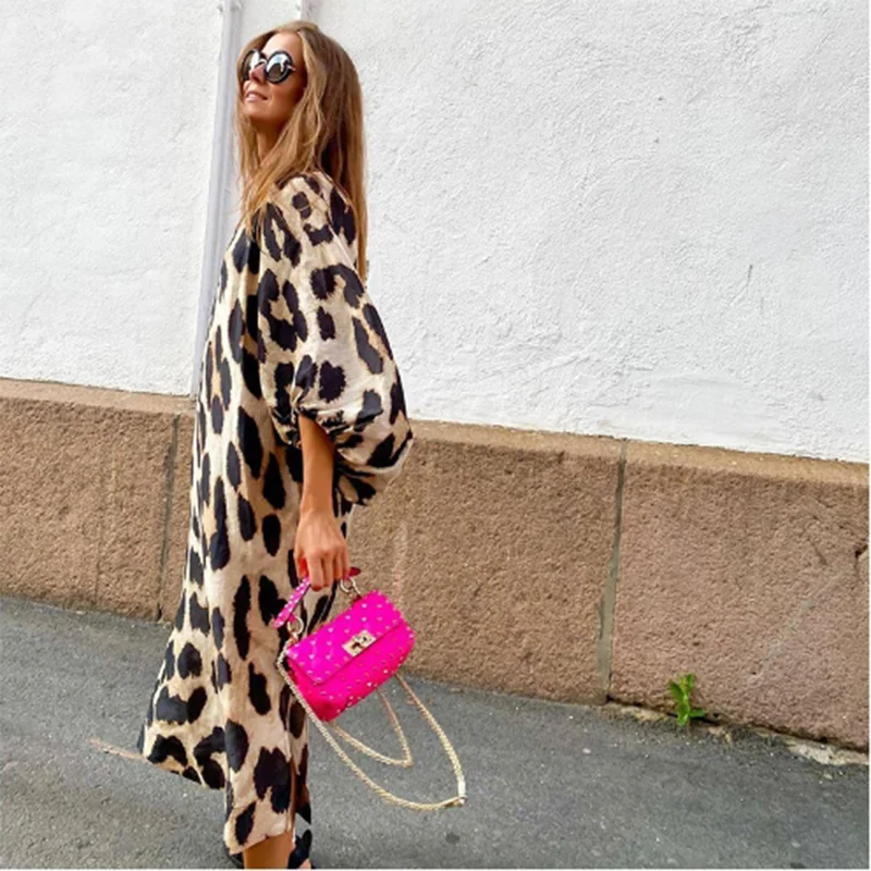 SpecificationsDresses Length: Ankle-LengthElasticity: Non StretchFit Type: LooseMaterial: Polyester BlendedNeckline: V-NeckPattern Type: LeopardSilhouette: LooseSleeve Style: Lantern SleeveStyle: Casual