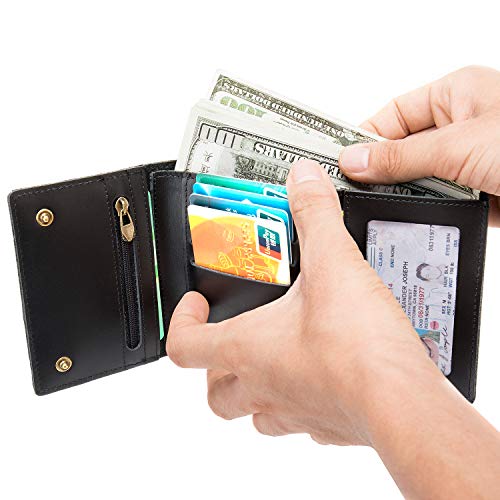 NIUCUNZH Mens Genuine Leather Small Trifold Wallet on Chain with ID Window and Zipper Pocket Black, Rfid Blocking 6