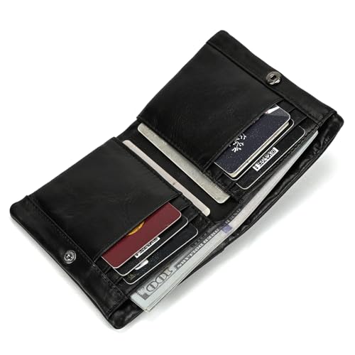 Genuine Leather Bifold Wallet with Multiple Card Slots for Men and Women, Slim Coin Pocket Cash Credit Card Holder Zipper Purse, Black 7