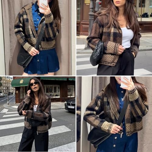 HOT ! Chevara Women’s Checkered Cardigan Sweater Vintage Lapel Collar Long Sleeve Zip Up Knit Sweatshirt Jacket