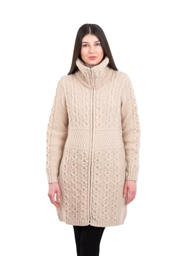 HOT ! SAOL Irish Cardigan for Women with Pockets Made of 100% Merino Wool Ireland Long Coat