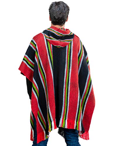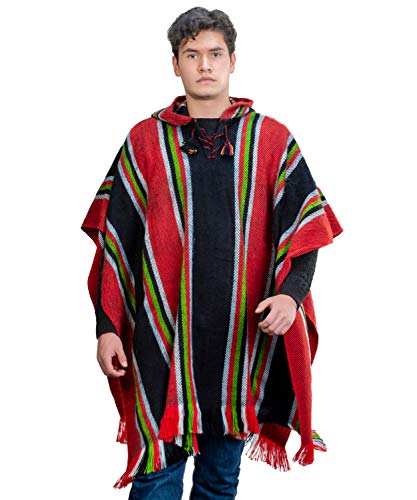 HOT ! Traditional Hooded Poncho for Men in Black and Red Alpaca Wool - Cloak Cape for Winter