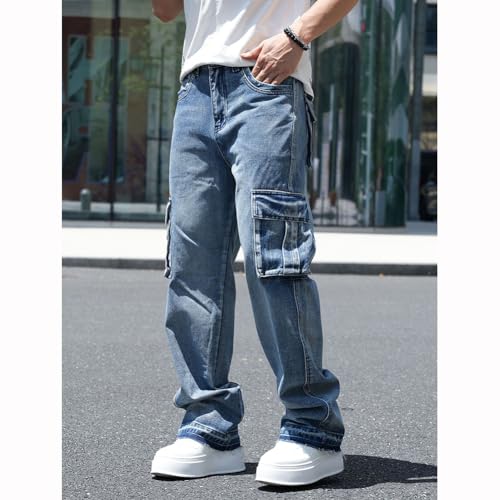 • Feature: Button fly with zipper closure, straight leg, loose fit style,mid rise, ripped frayed cuff, casual hip-hop cargo jeans for men streetwear