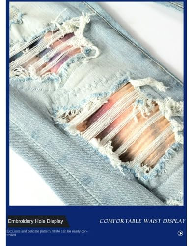 More information about Jeans Pants Trouser Denim Trendy Street Piercing Patch Elastic Slimming Worn Hole Water Washed Blue Grinding Fading Tight Casual Small Foot for Men(Light Blue,33)