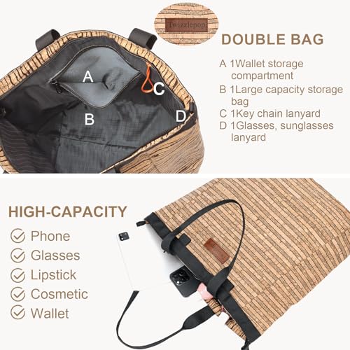 Cork Tote Bag with Zipper, 15 Inch Large Capacity Tote Bag for Women Work And Travel,Laptop Bag With Pocket 5