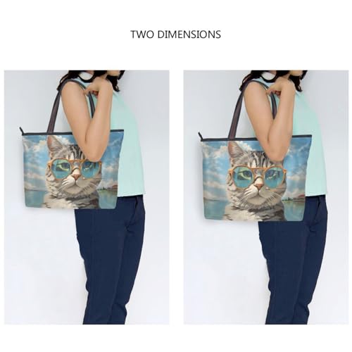 HOT ! Women's Tote Bag Cat Wear Glasses Print, Reusable Grocery Handbag Bags with Zipper Large