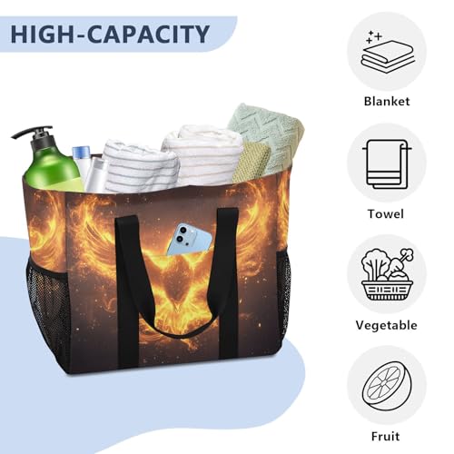 HOT ! Large Waterproof Travel Tote Bag for Women Men, Phoenix Flames Canvas Beach Bag with Lining & Pockets - Reusable Grocery/Laundry/Kitchen/Pool/Picnic Tote (15.4x9.8x12.8in)