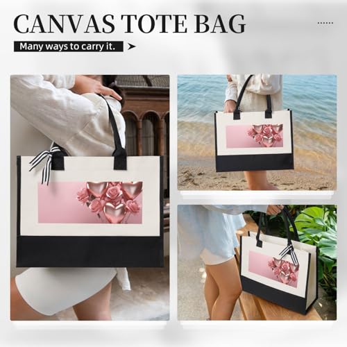Canvas Tote Bag for Women Beach Tote Purse Reusable Grocery Bag Pink Rose Balloon Heart Aesthetic Shopping Bags 3