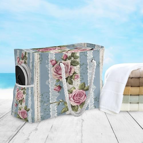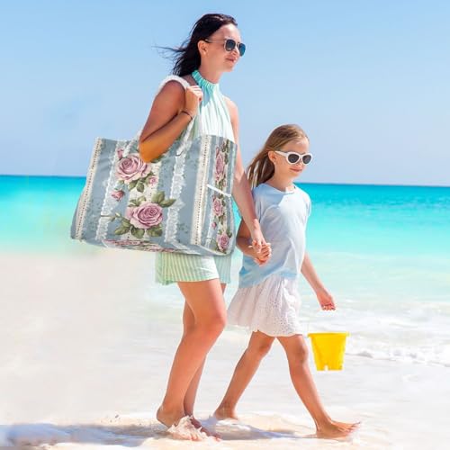 HOT ! Striped Polka Dot Pattern with Roses (2) Beach Bag & Travel Tote Bag Large Sandproof with Zipper Closure, Wet Pouch for Swim Gym Travel, Lightweight Foldable Outdoor Bag