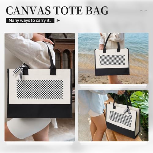 HOT ! Check Black White Checkered Pattern Checkerboard Eco-Friendly Canvas Tote Bag - Reusable Shopping Bag For Travel, Beach, Gym & Gifts
