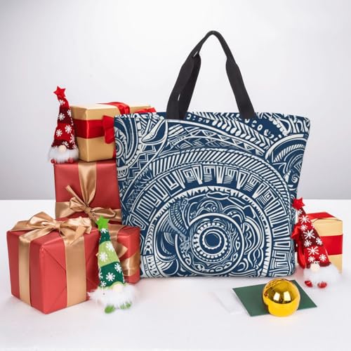 HOT ! (Blue Polynesian Maori Tribal Pattern) Large Reusable Tote Bag For Women Foldable Washable Shoulder Bag For Shopping Beach Travel Gym Work Stylish Gift Bag
