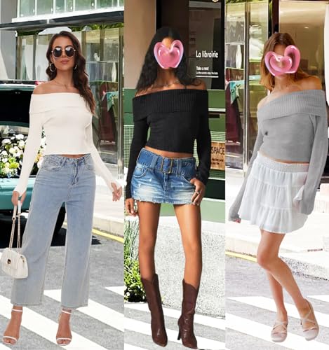 HOT ! Women Basic Fitted Long Sleeve Off Shoulder Crop Tee Top with Thumb Hole Rib Knit Sweater Y2k Crop Shirt Pullover Tops