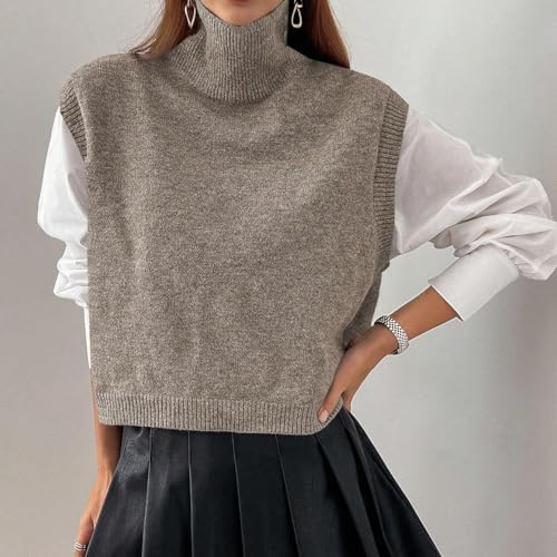 More information about Women High Neck Sleeveless Knit Crop Sweater Vest Casual Loose Fit High Low Hem Turtleneck Knitted Pullover Vest