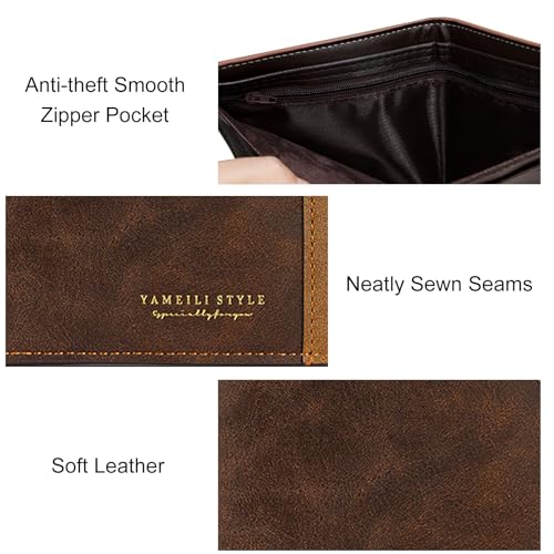 LJCZKA Bifold Leather Wallet Mens Slim Minimalist Wallets Thin Stylish Multi-card Holder with ID Window, Zipper Cash Pocket (Dark Coffee) 7