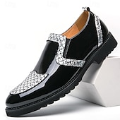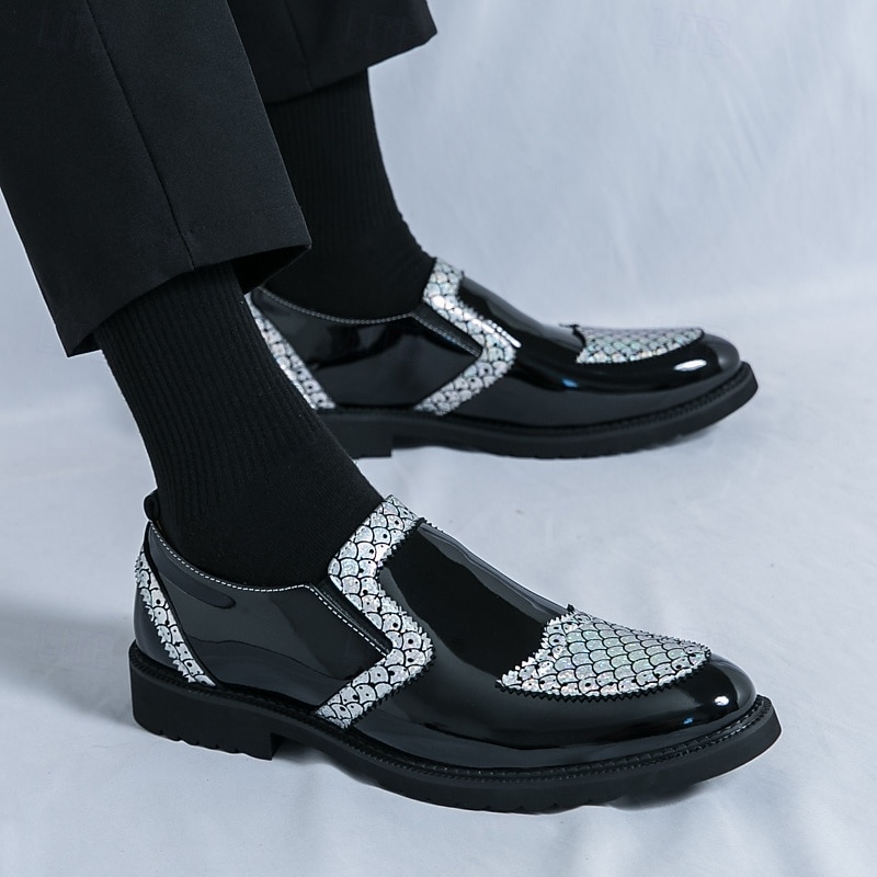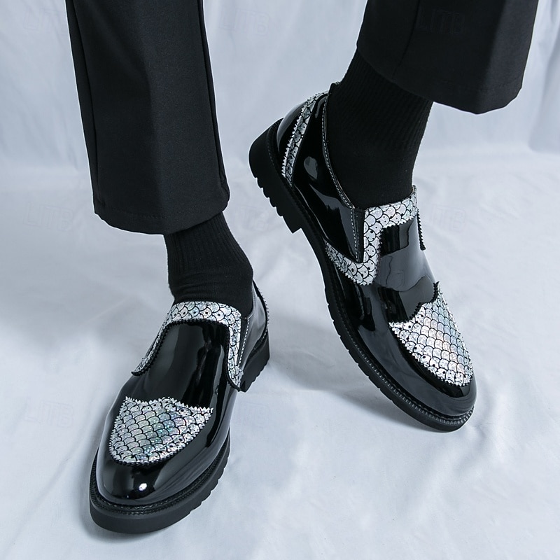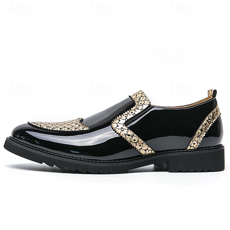 HOT ! Men's Patent Leather Slip-On Dress Shoes – Black Loafers with Gold Textured Detailing, Stylish Formal Footwear for Parties, Weddings and Special Events