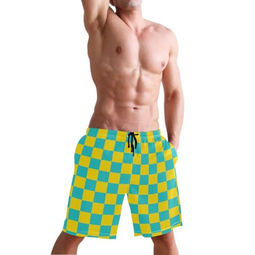 Yellow and Teal Buffalo Checkered Mens Swim Trunks Quick Dry Beach Shorts with Pocket S 1