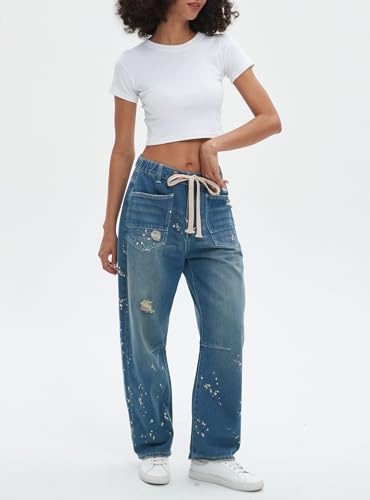 • Feature: Barrel jeans women, slouchy loose fit with tapered silhouette and wide leg design is suitable for most body types. Drawstring jeans women are ripped distressed style, paint splatter, elastic mid waist, with 14 pockets