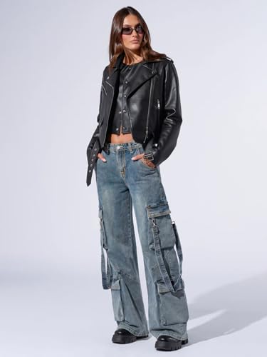 utcoco Women's Boyfriend Cargo Jeans Baggy Low Waist Wide Leg Denim Pants with Multi Pockets and Straps 1