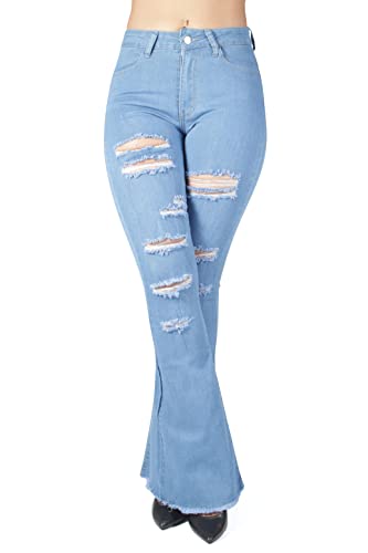 HOT ! Fashion2Love Women Junior Bell Bottom Ripped Distress High Waist Flared Stretch Jeans (HY338)