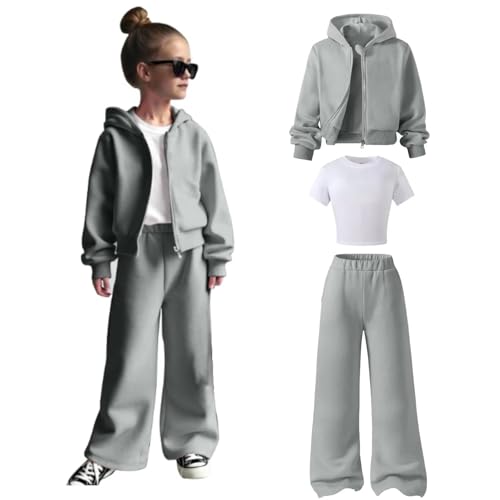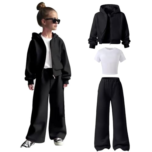 • Complete & Trendy Ensemble:This girls' 3 - piece hoodie outfit set is a must - have for fashion - forward young ones. It includes a stylish zip up hooded jacket, on - trend wide leg sweatpants, and a classic white T - shirt. Ideal for creating an effortlessly cool look for playdates, school, or casual outings, it meets the latest fashion demands in the girls' clothing category.