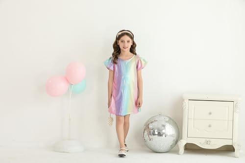 • 【Feature】: Girls' Sparkly dress with short flutter sleeves and a crew neck—Add a cute and trendy touch to the dress. The A-line Loose and flare silhouette that hits right above the knee.