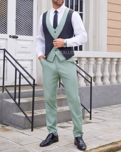 • STYLISH DESIGN - This suit is fashionable and unique: dual color matching, double layered design. The suit jacket features peak lapel, single breasted, one button closure, flap pockets on both sides, padded shoulders, 1 left chest pocket, and 1 inner pocket. The outer layer of the vest has one button, and the inner layer has two buttons. Solid color straight leg pants have front and back pockets, and a smooth zipper for opening and closing.