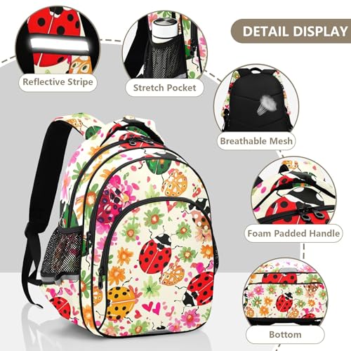 Joisal Back to School Bags Kawaii Colorful Ladybugs Floral Beige Girls' Backpack for Kids Student Travel Book Bag Teens Middle School Funny Backpacks Boys Medium 4