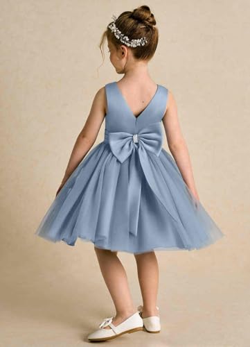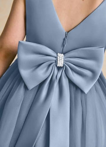 More information about Sleeveless V-Neck Satin Flower Girl Dress V-Back Tulle Skirt Hem Junior Bridesmaid Dress Knee Length with Bows