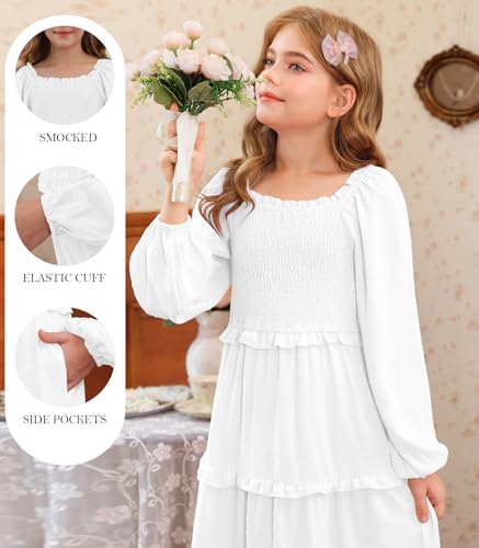 HOSIKA Girls Fall Long Sleeve Swiss Dot Smocked A-Line Ruffle Tiered Flowy Maxi Dress with Pockets 6-12 Years 6