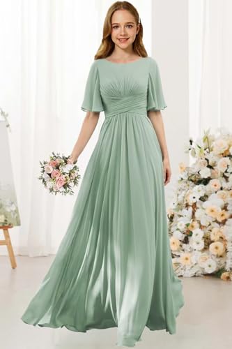 More information about Flutter Sleeves Junior Bridesmaid Dress Scoop Neck Chiffon Flower Girl Dresses with Ruffles A Line Wedding Party Gown