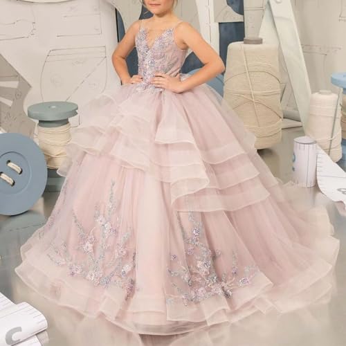 Flower Girl Dress Floral Appliques First Communion Dresses V Neck Princess Pageant Dresses Party Ball Gown 5