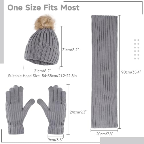 • All-in-one winter warmth set: keep cozy with our set of knitted hat, scarf, and gloves; simple monochrome with a playful pom-pom; easily coordinates with winter wear