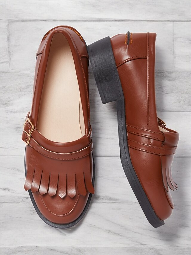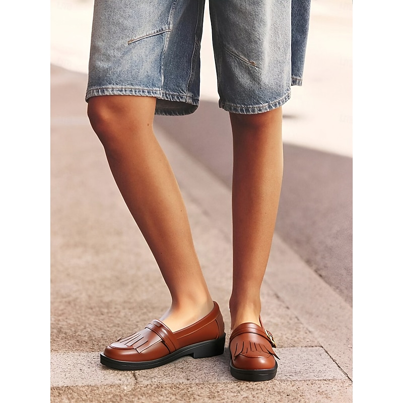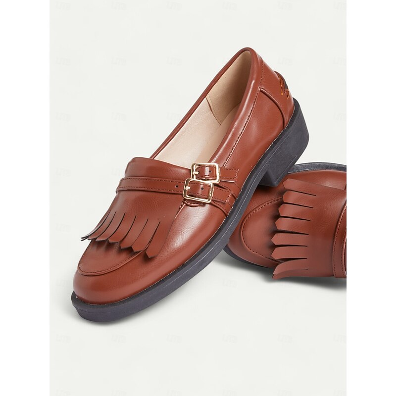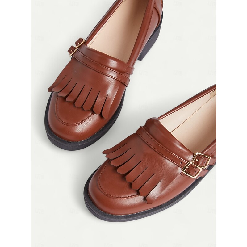 HOT ! Women's Brown Faux Leather Loafers with Fringe Detailing and Low Heel for Casual Wear and Office Style