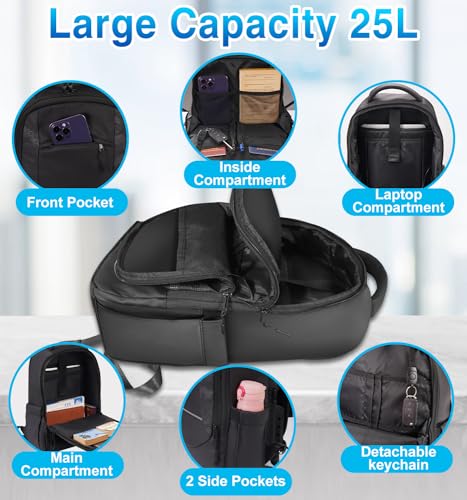 • 【Large capacity & Anti-Theft Design】:Size 17*11.8*7inch, 25 L capacity. A large-capacity laptop bag with 14 pockets offers ample space for all your travel essentials. For storing water bottles, shoes, and books, a camera, A 15.6“ laptop can easily store. The backpack can be opened 90°, making it easy to organize items, and can be quickly removed when taken out. There's also an anti-lost key chain where you can hang your keys. it is an anti-theft backpack suitable for leisure hiking